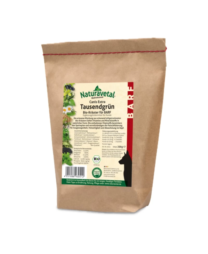 Naturavetal Bio BARF zeliščno mešanico Canis Extra Tavžentželišča za pse pazljivo posušimo na zraku, tako da se vsa hranila ohranijo v največji možni meri. Koncentrirana bio zelišča in začimbe za psa so prava energijska "bomba", ki oskrbujejo organizem z neprecenljivimi naravnimi vitamini, minerali in rastlinskimi snovmi. Bio zeliščna mešanica je idealna za spomladanske in jesenske kure, saj krepi imunski sistem psa.