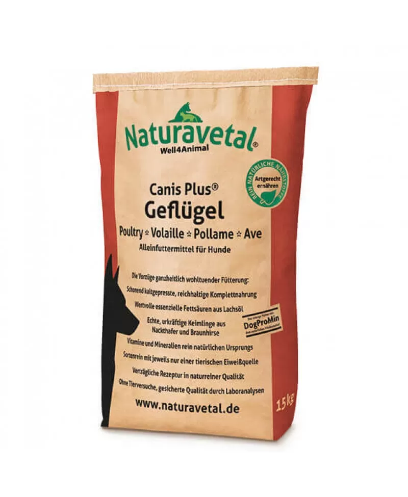 Hrana za pse Canis Plus je proizvedena iz svežih in skrbno izbranih visoko kakovostnih sestavin. Naturavetal ima zelo visoko postavljene standarde kakovosti in za doseganje le-teh so vse sestavine pod stalnim nadzorom. V Naturavetal hladno stiskani hrani za pse so vse sestavine predelane še sveže - brez dodajanja konzervansov. V preteklosti pes v divjini ni jedel le mesa, temveč je svoj plen pojedel vključno z drobovino (npr. rastline v drobovju plena) in zato je Canis Plus proizveden tako kot je predvideno v naravi psa.