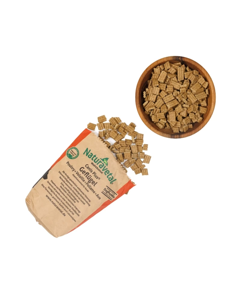 Hrana za pse Canis Plus z okusom piščanca je iz 100% naravnih sestavin za uravnoteženo popolno in zdravo prehrano psa. Proizvedena je s hladnim stiskanjem, brez polnil in sintetičnih dodatkov kot so ojačevalci okusa, umetna barvila, umetne arome, konzervansi,…. Vse od naštetih umetnih snovi lahko pri psu povzročijo razvoj različnih bolezni kot so alergije, prebavne težave, vneto kožo, itd... Vsebuje več kot 60% delež svežega piščančjega mesa. Naturavetal hladno stiskana hrana za pse je hrana za zdravo črevesno floro in dobro prebavo vašega psa. Zdravje se začne pri črevesju!