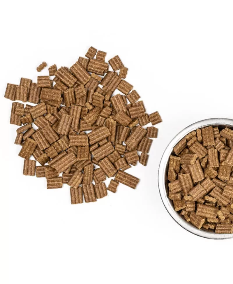 Viri ogljikovih hidratov so kuhani na pari, da se hranilne snovi ohranijo, poveča pa se prebavljivost hrane. V naslednjem koraku se vse sestavine osušijo in na koncu stisnejo. Pri stiskanju sestavine pasje hrane niso izpostavljene visokim temperaturam, temveč so s postopkom hladnega stiskanja preoblikovane v hrano - imenovano peleti za psa. Pri stiskanju se ne uporabljajo kemijski dodatki. Z zapletenim in skrbnim proizvodnim procesom zagotavljamo, da se kakovost in visoka vsebnost hranil v hrani ohrani.