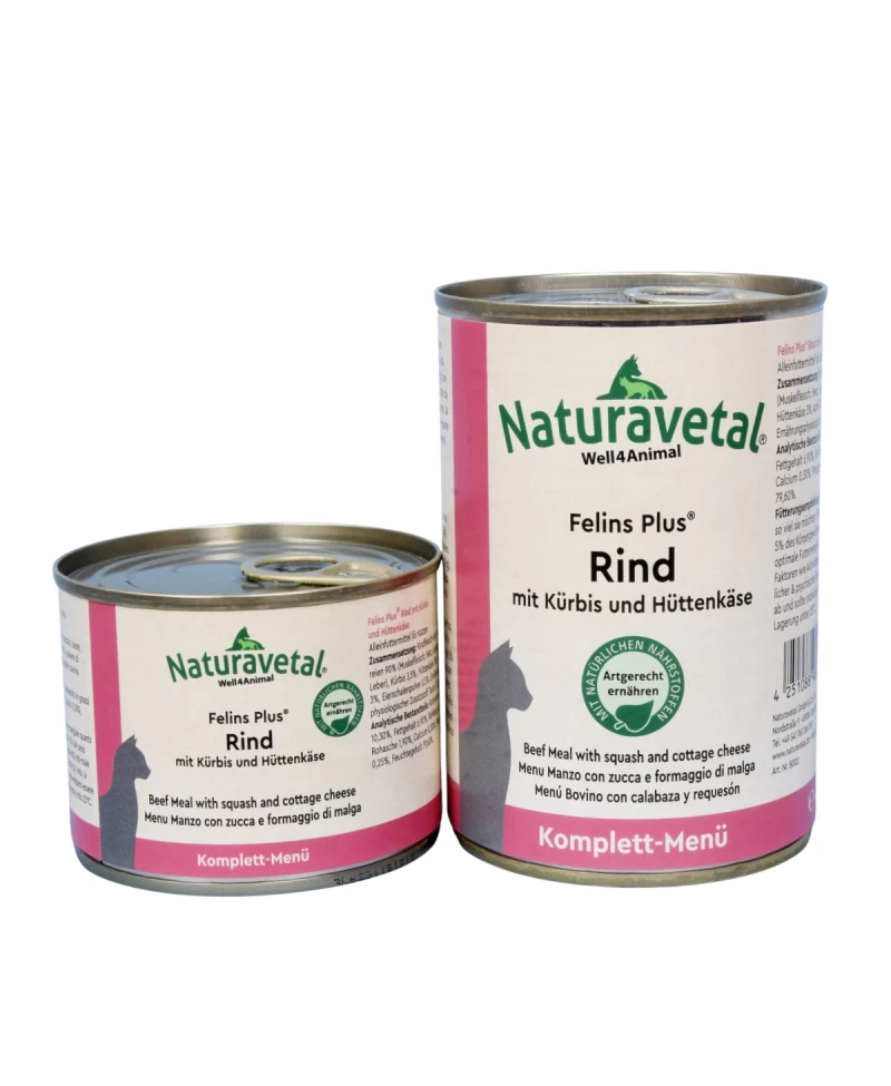 Felins Plus® Govedina z bučo in skuto je narejena posebej za mačke, z visoko 90% vsebnostjo mesa. Mačke so mesojede živali, ki se morajo prehranjevati s kakovostnim mesom. Pločevinke vsebujejo zraven mesa še manjši delež sadja, skute, zelenjave, jajčnih lupin in taurina, tako da mačka dobi vse potrebne minerale, vitamine in vlaknine za zdravo, dolgo in vitalno življenje ter čvrst iztrebek.