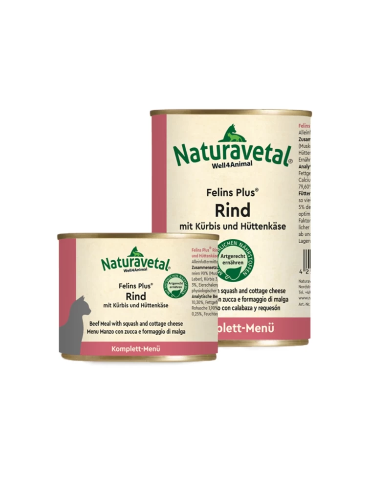 Felins Plus® Govedina z bučo in skuto je uravnotežena, popolna hrana za mačke, ki vsebuje visokokakovostno meso, zelenjavo, sadje, skuto, tavrin in jajčne lupine v prahu.