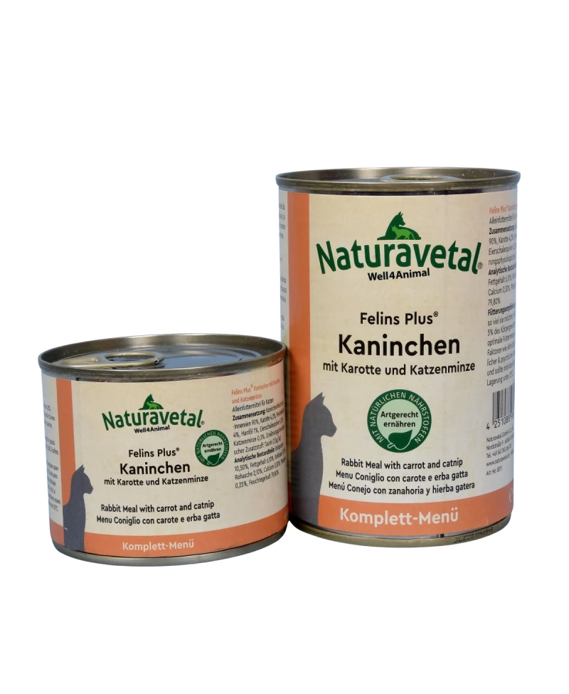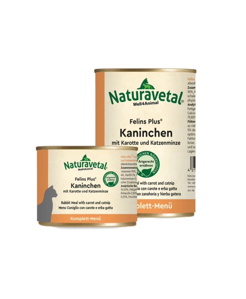 Felins Plus® Kunec s korenčkom in mačjo meto je uravnotežena, popolna hrana za mačke, ki vsebuje visokokakovostno meso, zelenjavo, tavrin, jajčne lupine v prahu in mačjo meto – prava poslastica za izbirčne mačke.