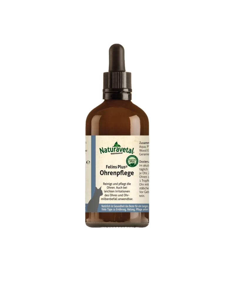 Naša Felins Plus® nega ušes je bila posebej razvita za nežno čiščenje občutljivih mačjih ušes, njihovo nego in podporo naravnemu ravnovesju občutljive kože – popolnoma brez umetnih dodatkov. Kapljice za nega ušes Felins Plus temeljito in nežno očistijo mačja ušesa. Kapljice se lahko uporabljajo tudi preventivno, da preprečimo morebitna vnetja in okužbe z ušesnimi garjami. Mnoge mačke so zaradi okužbe s pršicami nagnjene k smrdljivim, včasih umazanim rjavkastim ušesom. To je velikokrat povezano s srbenjem in vnetjem. V takšnih primerih so Felins Plus kapljice za nego in čiščenje mačjih ušes osvežilni izdelek, ki nudi učinkovito pomoč.