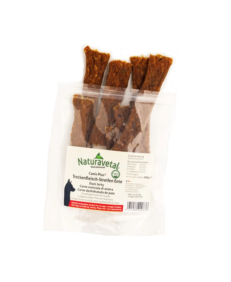 Naj bo to iskana nagrada med pasjimi športi ali prigrizek na napornih pohodih - naš prigrizek iz suhega račjega mesa prepriča s svojim aromatičnim okusom in zagotavlja dodatno porcijo energije. 100% nežno sušeno čisto račje meso, brez umetnih dodatkov in konzervansov pomeni najboljši prigrizek ali poslastico med obroki. Nežno obdelano račje meso, oblikovano v približno 10-15 cm dolge trakove suhega račjega mesa lahko z roko zlahka razlomite na manjše kose, zato jih lahko enostavno hranite na poti kot okusno in hitro nagrado. Zaradi precej mehke konsistence je okusen prigrizek iz suhega račjega mesa primeren za aktivne pse vseh velikosti in pasem, tudi najbolj razvajeni gurmani pa se našega prigrizka iz suhega račjega mesa ne bodo mogli naveličati.