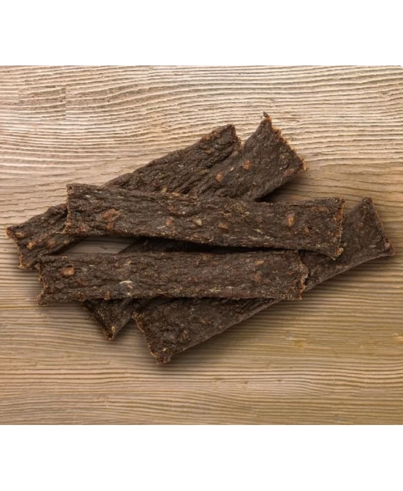 Nežno obdelani trakovi suhega mesa dolžine približno 10–15 cm se zlahka zlomijo z roko, zato so idealna nagrada na poti ali med treningom. Zaradi mehkejše teksture je okusen prigrizek iz zajčjega mesa primeren za pse vseh velikosti, še posebej pa ga priporočamo za prehransko občutljive starejše pse, mladičke in mlade pse.