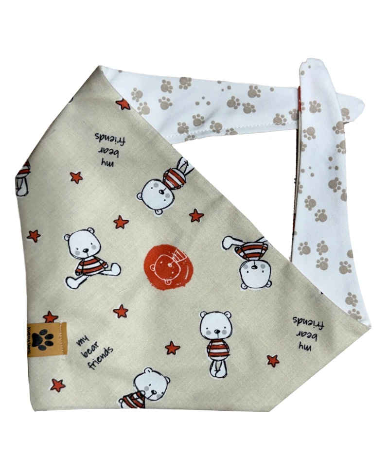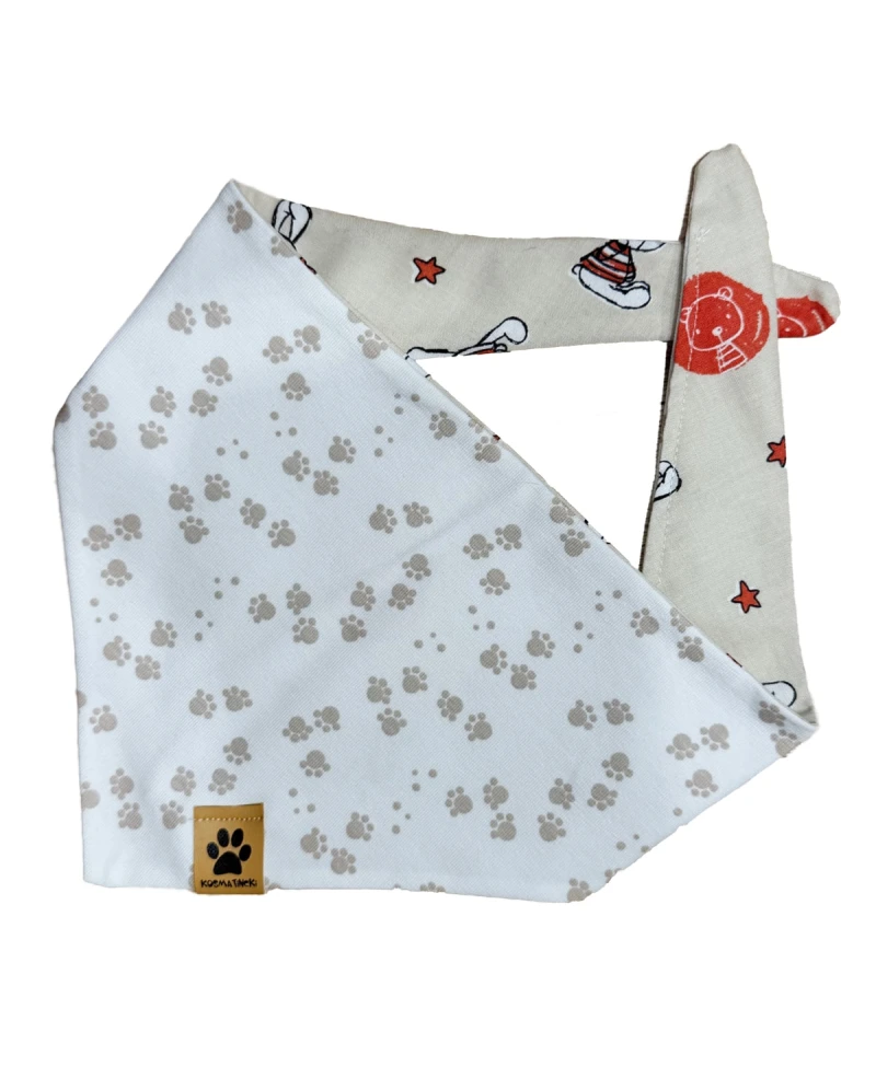 Rutka za pse Lun je prav poseben modni dodatek za vašo kosmatinko ali kosmatinca. Rutka je odtenkih bele in bež barve v kombinaciji z rdečimi motivi. Zaradi kombinacije barv se bo rutka Lun podala na vsako barvo dlake in tako obogatila lepoto vašega kosmatinca. Ena stran rutke je bele barve z navihanimi šapicami v bež barvi. Druga stran rutke je bež z rdečimi zvezdicami in simpatičnimi medvedki. Rutka za pse se lahko nosi na sprehodih, doma na kavču, za res dobre in odštekane fotke ali kadar se s kosmatincem odpravite na obisk k pasjim prijateljem. Rutka je dvostranska, nosi se lahko na obeh straneh in se preprosto zveže okrog vratu.