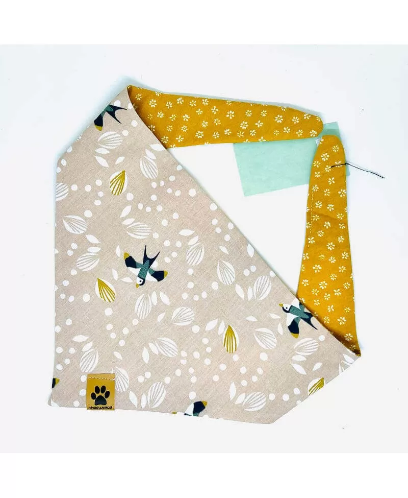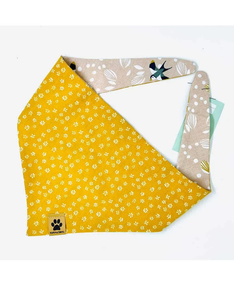 Rutka za pse Jona je lep modni dodatek za vašega kosmatinca. Rutka je dvostranska. Ena stran rutke je iz bombažnega poplina v oker rumeni barvi s posejanimi belimi cvetovi. Drugo stran rutice krasijo radovedne lastovke med belimi listi na svetlo bež podlagi. Svetla in temna kombinacija se bo tako podala vsem kosmatincem, ne glede na barvo kožuščka. Rutka za pse se lahko nosi na sprehodih, doma na kavču, za res dobre in odštekane fotke ali kadar se s kosmatincem odpravite na obisk k pasjim prijateljem. Rutka se preprosto zaveže okrog vratu.