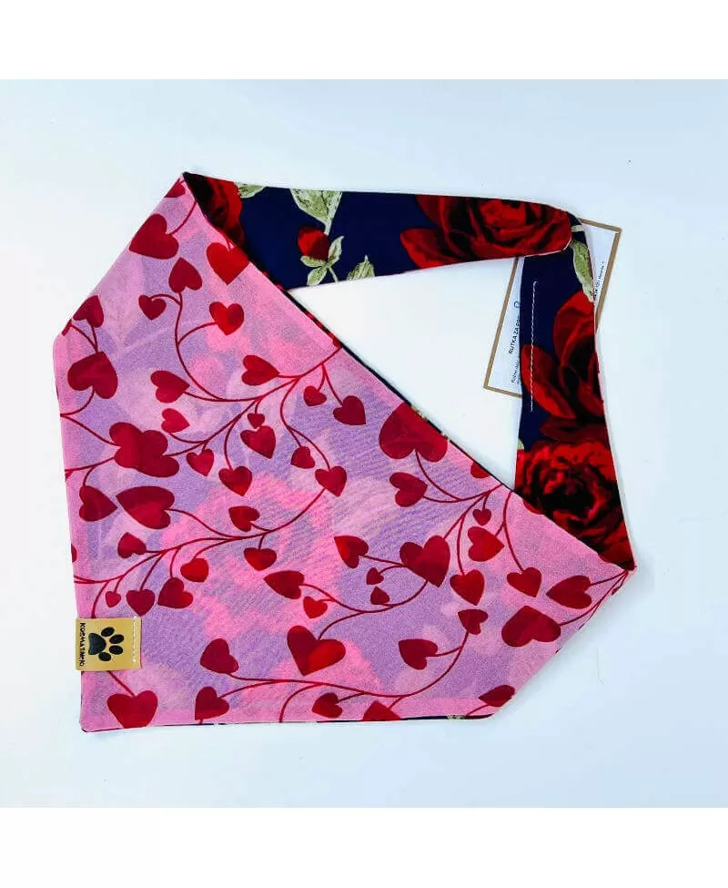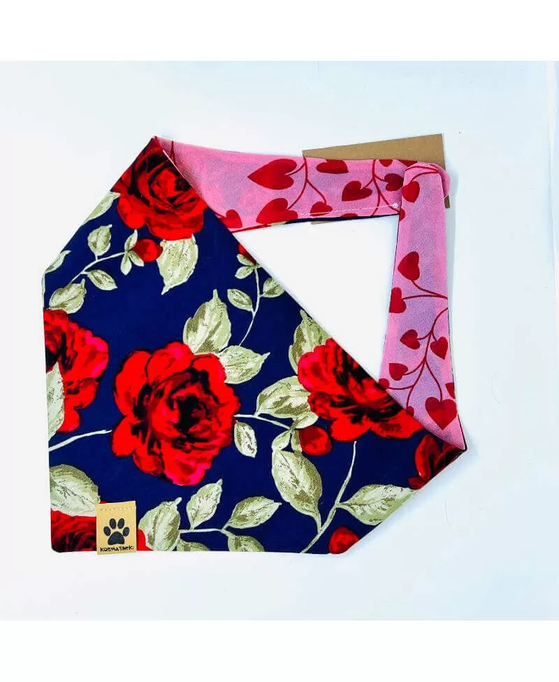 Rutka za pse Roza je v odtenkih rdeče in temno modre barve z vzorcem vrtnic in srčkov. Rutka je dvostranska in se lahko nosti na obeh straneh. Ena stran rutice je iz tankega svilenega materiala v odtenkih roza barve s posejanimi rdečimi srčki. Druga stran rutice je temno modre barve z rdečimi cvetovi vrtince. Rutka za pse se lahko nosi na sprehodih, doma na kavču, za res dobre in odštekane fotke ali kadar se s kosmatincem odpravite na obisk k pasjim prijateljem. Rutka se preprosto zaveže okrog vratu.